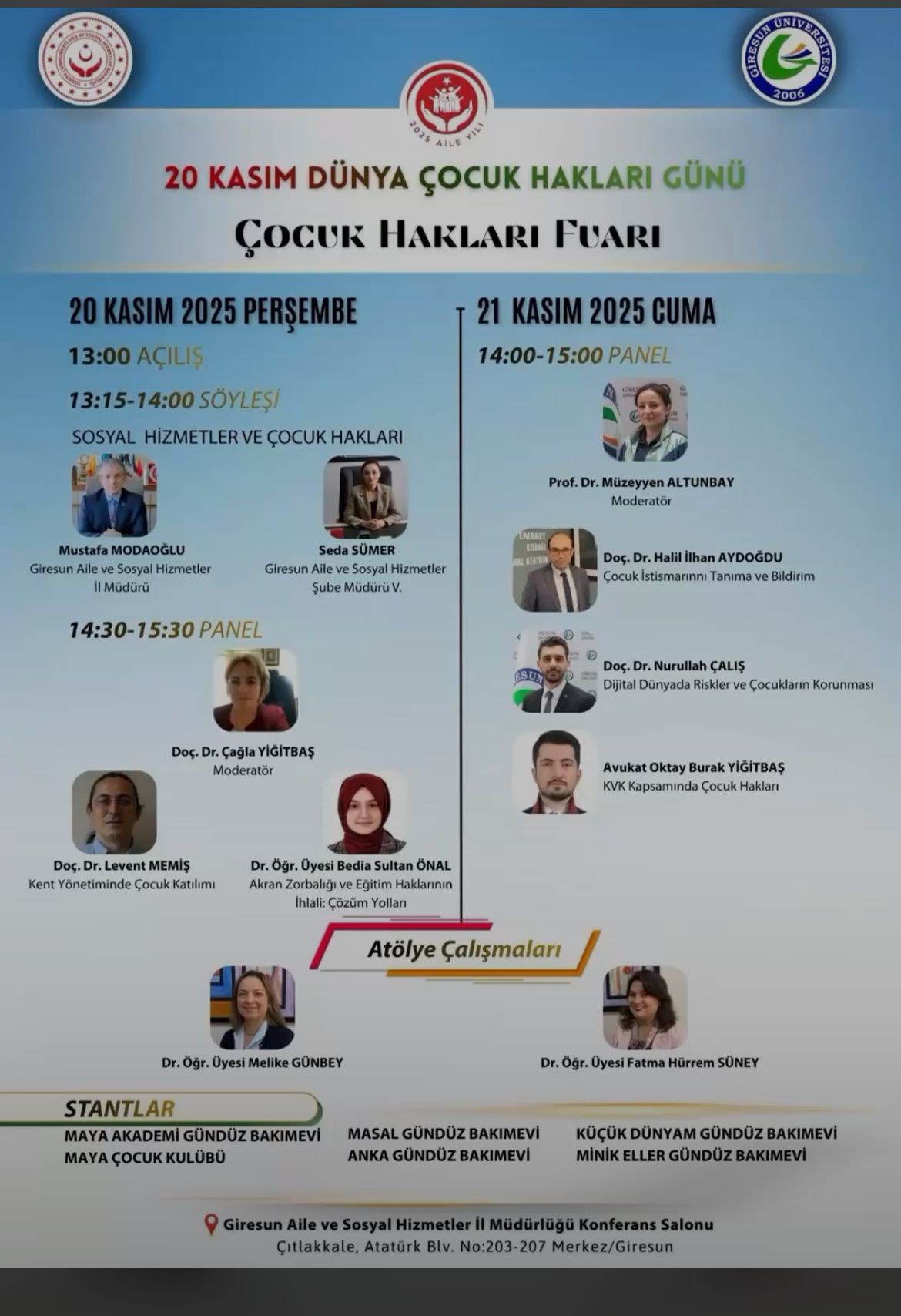 Fakültemiz öğretim üyeleri Doç. Dr. Çağla YİĞİTBAŞ ve Doç. Dr. Nurullah ÇALIŞ, Aile ve Sosyal Hizmetler İl Müdürlüğü ile GRÜ Çocuk Hakları Merkezi işbirliğiyle gerçekleştirilen 20 Kasım Dünya Çocuk Hakları Günü kutlaması kapsamındaki Çocuk Fuarında moderatör ve panelist olarak katkı sağlamışlardır.