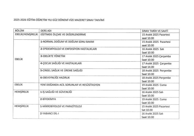 2025-2026 Eğitim-Öğretim Güz Dönemi Vize Mazeret Sınav Takvimi