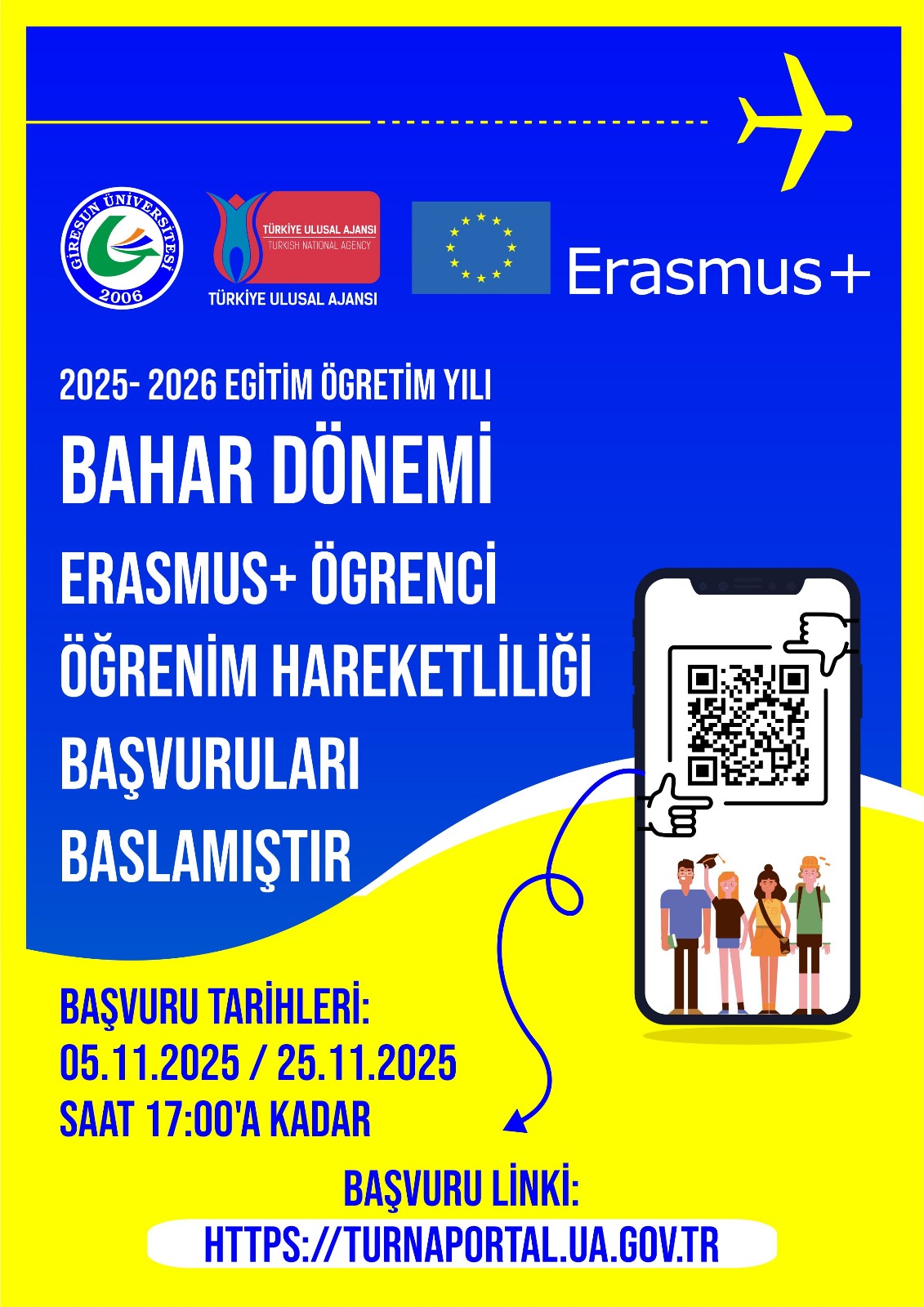 Üniversitemizin yürütücüsü olduğu 2024-1-TR01-KA131-HED-000197240 ve 2025-1-TR01-KA131-HED-000311464 numaralı Erasmus+ projeleri kapsamında, 2025–2026 akademik yılı bahar dönemi “Erasmus+ Öğrenci Öğrenim Hareketliliği” faaliyeti için katılımcı seçim süreci başlamıştır.
