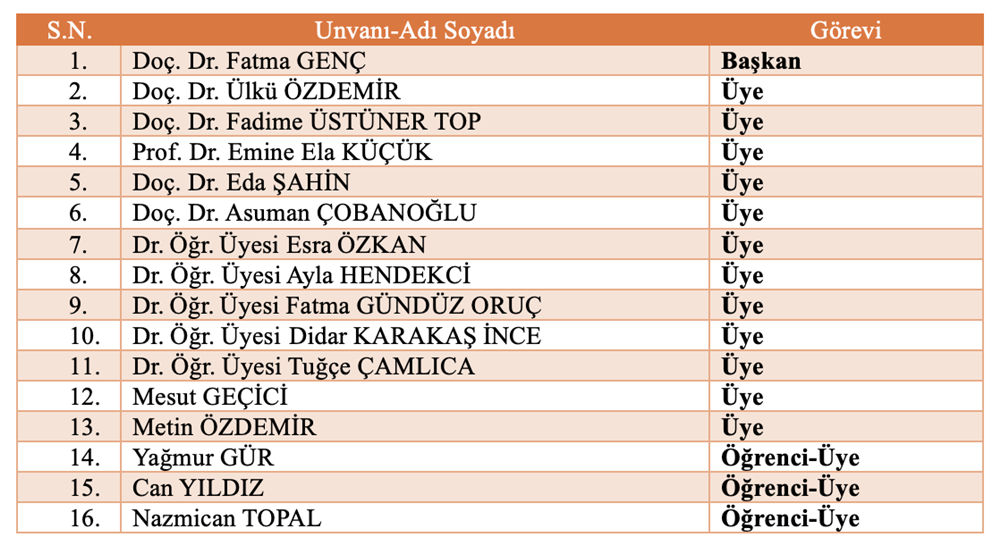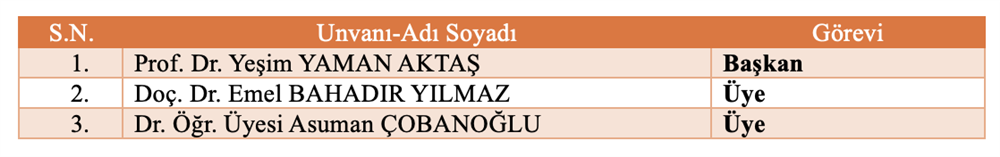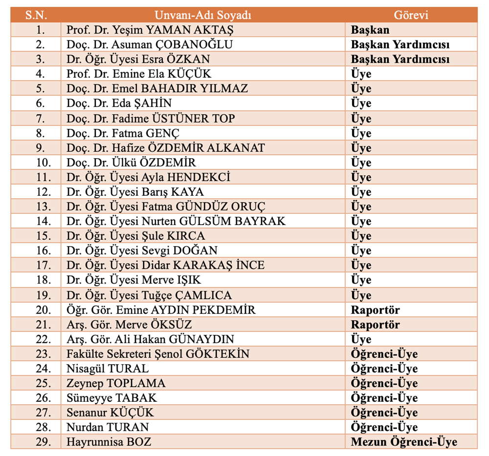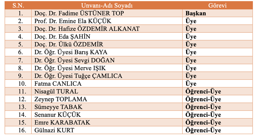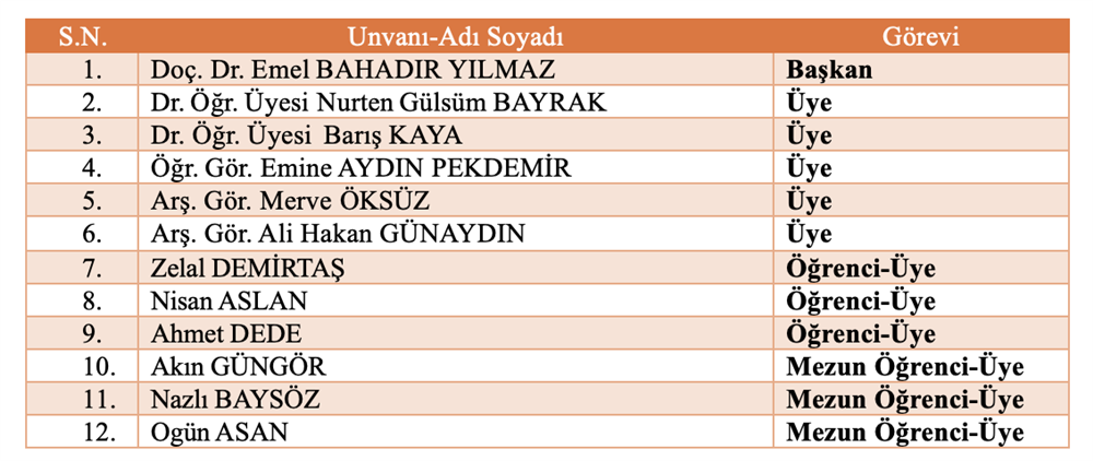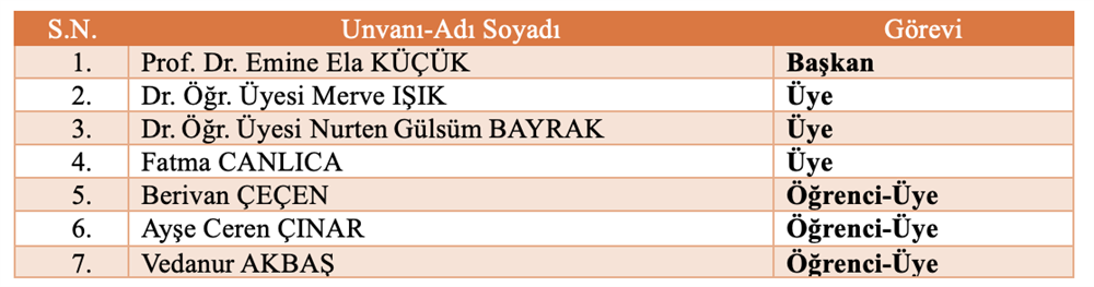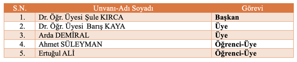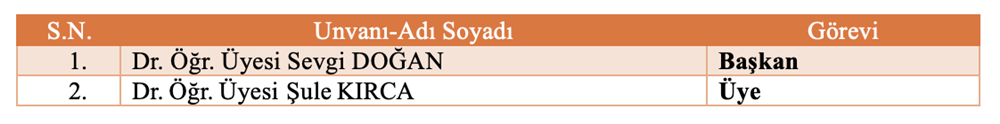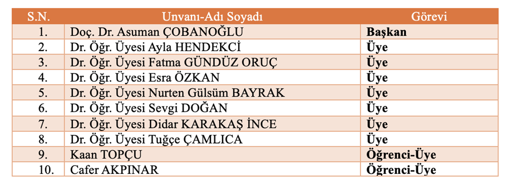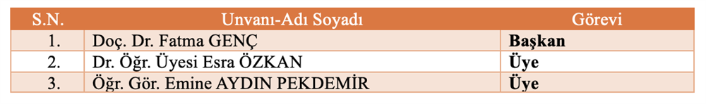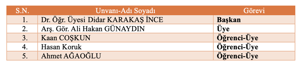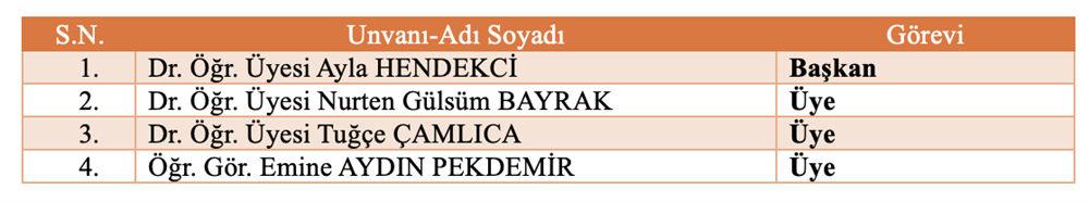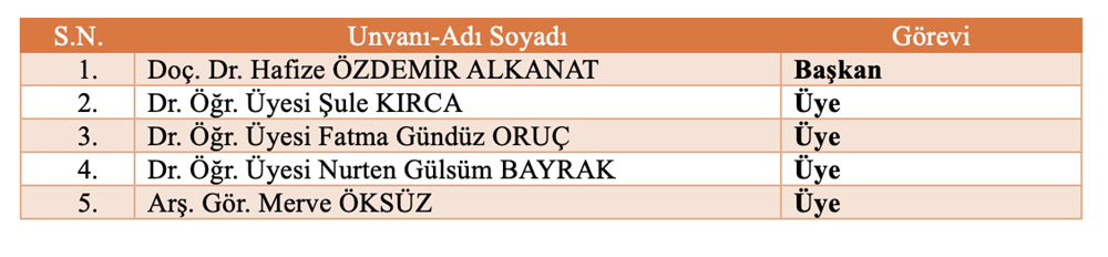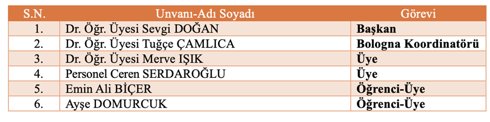 Bölüm Bilimsel ve Sosyal Etkinlikler Komisyonu Bölüm Akademik Teşvik Komisyonu Bölüm Akademik Performans Değerlendirme ve İzleme komisyonu Bölüm Web Tasarım Komisyonu Bölüm Tanıtım ve Kariyer Komisyonu Ölçme ve Değerlendirme Komisyonu Sıfır Atık Komisyonu Akademik Danışmanlık Komisyonu Bologna Komisyonu Mezun Profil Komisyonu