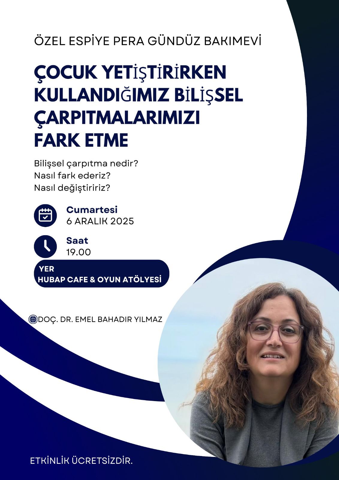 Fakültemiz öğretim üyelerinden Doç. Dr. Emel Bahadır Yılmaz, Özel Espiye Pera Gündüz Bakımevi'nin daveti üzerine 6 Aralık 2025 tarihinde "Çocuk Yetiştirirken Kullandığımız Bilişsel Çarpıtmalarımızı Fark Etme" isimli bir seminer vermiştir. Öğretim üyemize başarılar dileriz.